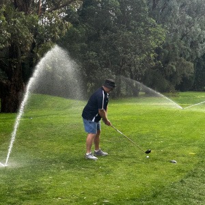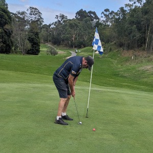 Gavin can hit the ball a country mile, but, early on, his direction and range control was a bit off. So much so that he had to declare lost on both the first and second holes. He did make two shots that would be contenders for Michael’s ‘Shot of the Round’. On the 8th, he had a ball in the long close to the OOB fence, and close to a post that blocked any shot parallel to the fence. Rather than take the penalty for relief, he faced the fence, gave it a good whack, and the ball popped up and back over his head, leaving him with a better view of the green than the relief would have given. The second gets my vote. On the 17th, his drive finished just over a metre short of the tree on the corner, completely stymied except for the gap between the two trunks. Nothing ventured, nothing gained, he took out some sort of a wedge and smashed it through the gap to land it on the green, almost as a slam dunk, to finish within puttable distance of the hole.